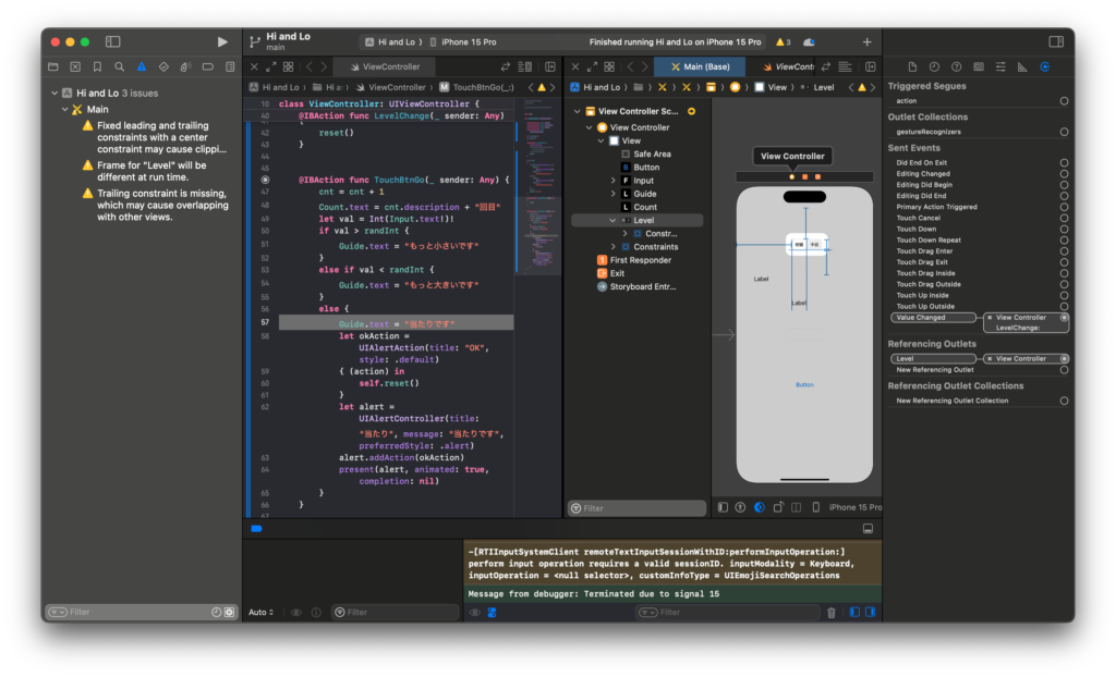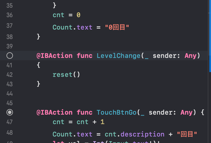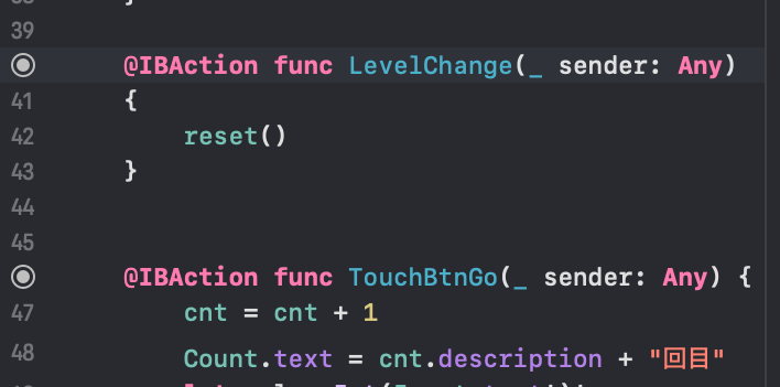 これで実行すると、セグメンテッドコントロールを操作しても何も変わらなくなります。1ゲーム終了 すると反映されるようになります。そういう仕様でも良いとは思いますが、コントロールを変更してい るのに何も変化が無いというのは、使っている人が戸惑うかと思い、LevelChange関数を加えました。