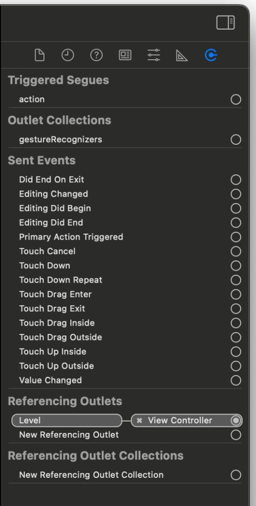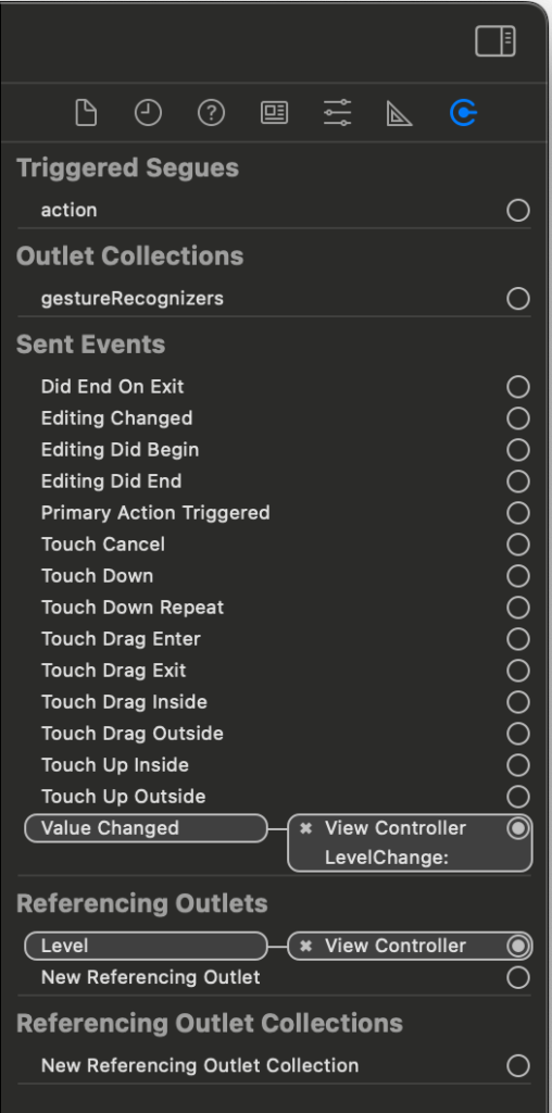 それでは×マークをクリックした方は、セグメンテッドコントロールを選択して、また右上の一番右のア イコンをクリックし、Value Changedの右の⚪︎からコード領域のLevelChangeの所までドラッグ&ドロップして再リンクします。